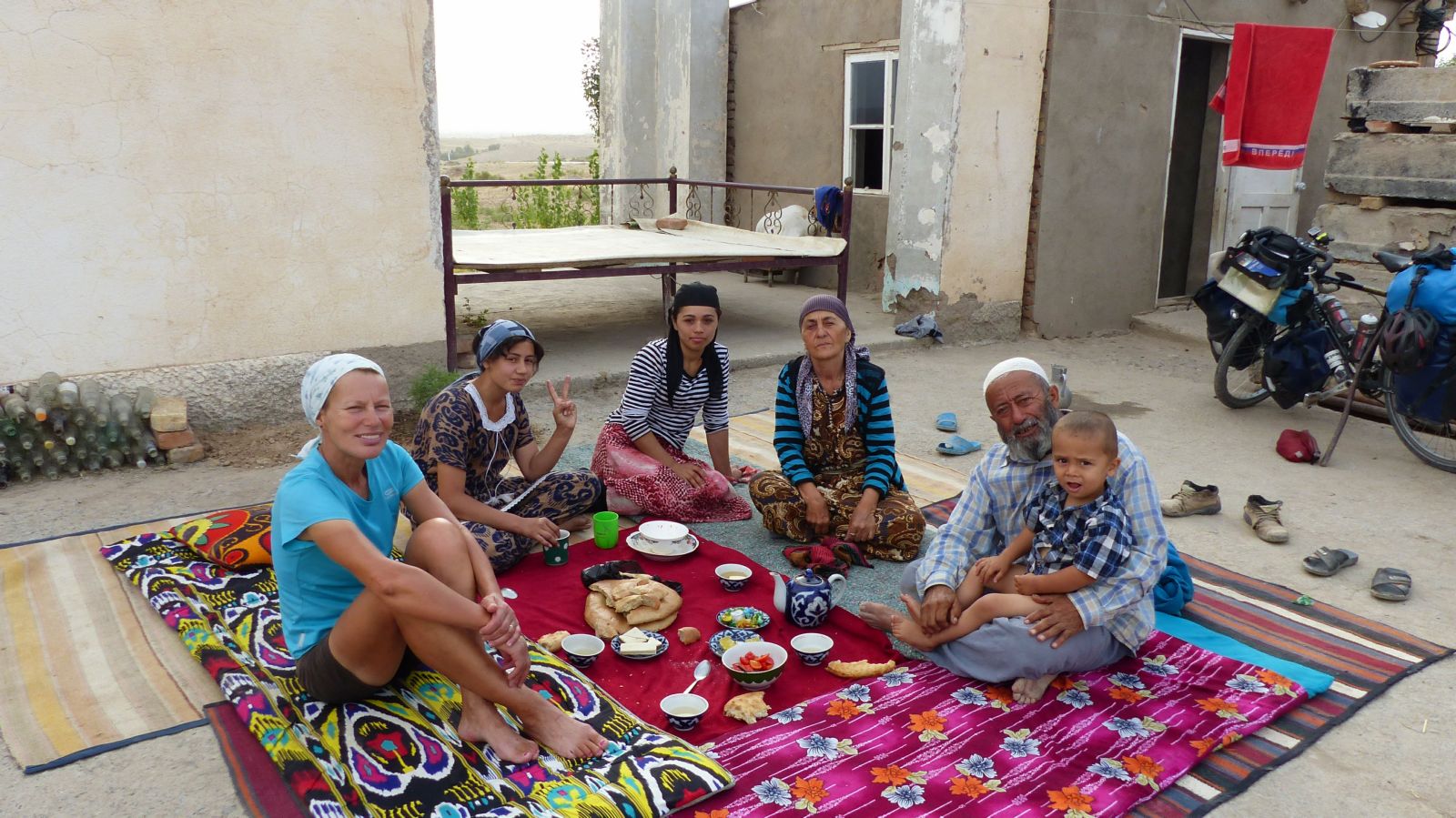 Vers le milieu de l'ascension, alors qu'il commence à pleuvoir, Un jeune homme nous invite à boire le thé dans un hameau. Nous sommes accueillis par cette famille Tadjik qui nous offre l'hospitalité. Nous passons la nuit au sec alors qu'il pleut dehors. Les femmes de cette famille ont une vie très rude, elles travaillent du matin au soir. Elles nous montrent leurs mains crevassées, avec beaucoup de bonté, Nicole leur donne un tube de pommade hydratante et cicatrisante ainsi que de la crème Nivéa en notre possession, leurs visages rayonnent de joie après ce présent, elles en font part à tout l'entourage.